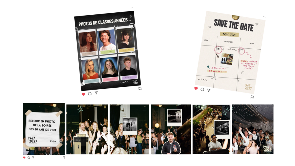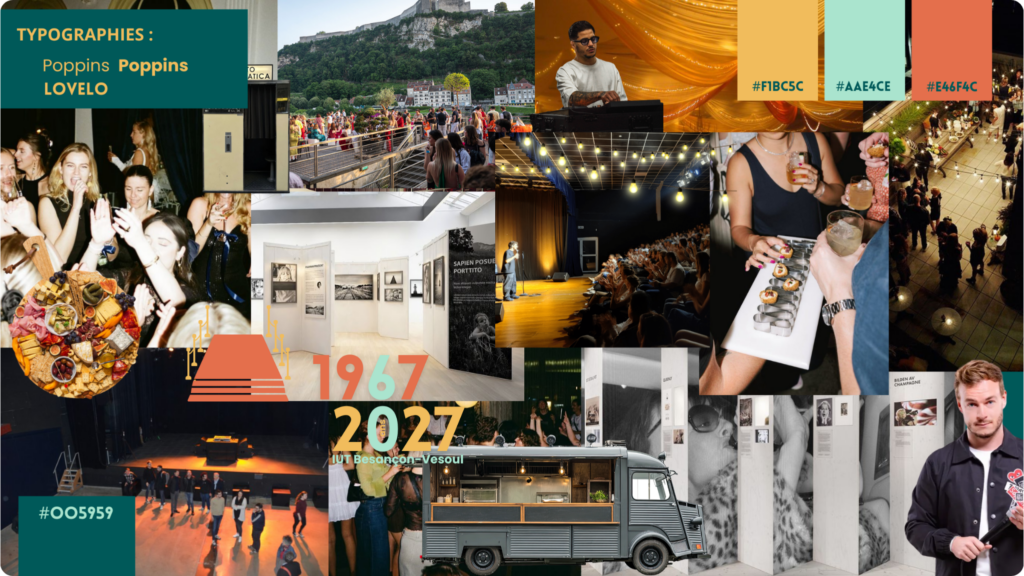 Nous avons ainsi imaginé un premier temps l’après-midi, centré sur un moment convivial et fédérateur, favorisant les échanges et la participation des étudiants à travers différentes animations au sein de l’IUT. Puis, un second temps en soirée, plus festif, pensé comme un véritable événement célébratif pour marquer les 60 ans de l’IUT dans une ambiance dynamique et immersive à la Rodia à Besançon.