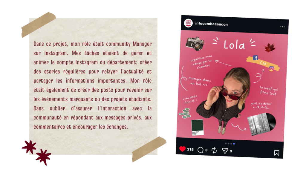 Ce projet m’a permis d’ajouter de nombreuses cordes à mon arc comme être réactive, améliorer ma méthode de veille, création de contenus graphiques et pratiques, augmenter ma créativité et bien plus encore. De plus, travailler étroitement avec Anna et Léane sur le compte instagram a été très fluide, nous avons su facilement se créer un bon rythme pour se partager le travail , réagir avec la communauté.